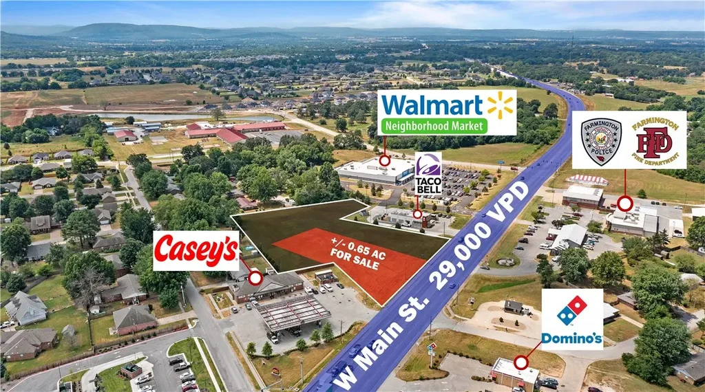 Your opportunity to capture +/- 0.65 Acres of prime commercial land in the thriving community of Farmington, offering outstanding development potential! This property features level, open terrain with significant road frontage along W Main St., which sees over 29,000 VPD! A cross access easement agreement with Walmart on the southwest side enhances accessibility. Utilities are conveniently available on-site or nearby. Surrounded by popular businesses, including Casey's General Store, Taco Bell, Walmart Neighborhood Market, this parcel is in a bustling area. Additionally, it is less than 1.6 miles from Farmington High School and it's newly built $16 million sports complex, and only 6 miles from the University of Arkansas. This is an exceptional opportunity to invest in a rapidly growing area!