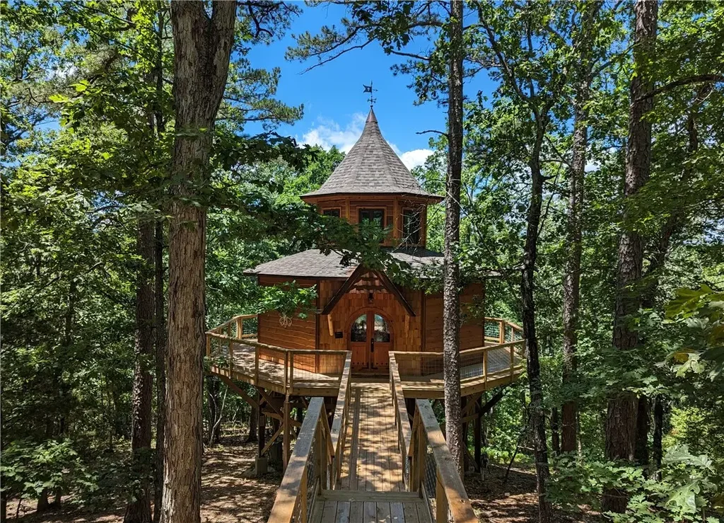 SHOWN BY APPOINTMENT ONLY. Enchanted Treehouses is a popular luxury treehouse resort offering six custom treehouses and an office surrounded by 52 acres of park-like woods. Each treehouse comes beautifully furnished and has a stone fireplace, Jacuzzi for two surrounded by windows to take in the views, a separate bathroom with walk-in shower, king-sized bed, kitchenette stocked with dishes and cookware, an apartment-sized fridge, microwave, electric counter cooktop and coffee pot, gas grill on the back deck, cable TV and Wi-Fi. Infrastructure is in place for four more treehouses. You'll enjoy the seclusion and unrestricted land to expand. The perfect terrain to create a trail system and close to trails at Leatherwood and Black Bass parks. Ideal location to expand into the wedding business. Fantastic website and 75,000 Facebook followers. Take the trolley 1.5 miles to downtown shopping and dining. (Private property for treehouse guests only. Do not drive thru looking without a real estate agent and an appointment).