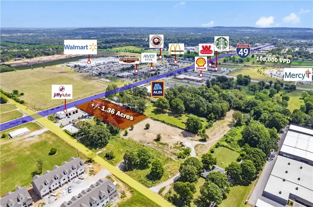 Prime re-development opportunity on +/- 1.36 acres of level land right off Elm Springs Rd, which sees around 17,000 VPD! This piece of land is strategically located near one of the busiest Walmart Supercenters, considered a "Test Store" and just a half mile from I-49, which sees around 108,000 VPD/ Surrounded by excellent neighboring businesses including Aldi, Arvest Bank, Jiffy Lube, Firehouse Subs, Starbucks, Shell Gas Station and more. These businesses help provide a solid local demographic and potential customer base. Sewer is available on the site next door. Currently Zoned C-5 Thoroughfare Commercial, allowing for endless development potential, including, office/retail buildings, medical facilities, hotel, and more! Don't miss out on this ideal site for your next project!