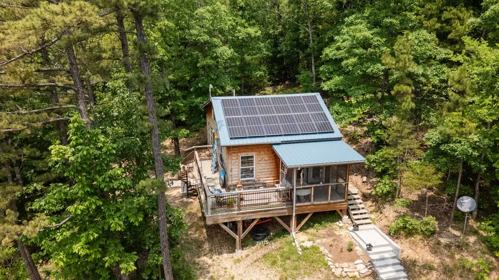 Off Grid Cabin in the Woods joining the Arkansas Game and Fish 15,000 ac Madison County, AR 1 mile to Rockhouse Boat launch. Well-built cedar cabin move in ready. 840 sq. ft. Built in 2020. 1 bedroom with a loft. The Screen porch opens to sun deck, vaulted ceilings give an open airy feel to this lovey hidden gem of a cabin located in an Exclusive area of NW Arkansas. Spring water-gravity fed, Solar panels, batteries, propane tank and storage building convey. Spring fed creek along south border. Live off Grid in a recreational park. The deck has Views of 15,000 acres of wooded Wilderness that changes with the seasons but not with development. Very private end of the road location. Bike, hike, fish, hunt, explore, kayaking, enjoy no light pollution and see the stars. Wonderful VRBO potential. 20 minutes to down town Eureka Springs or Huntsville AR. Kings River Rockhouse access 1 mile, Trigger Gap access 3 miles.