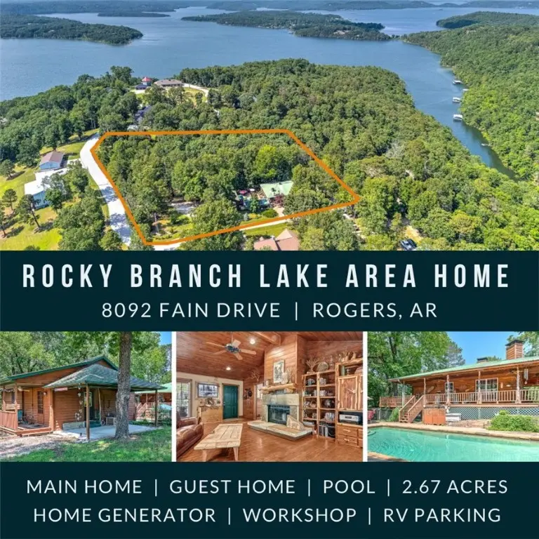 Escape to the rustic charm of this 2.78-acre lodge-style retreat near Beaver Lake’s Rocky Branch, featuring a 3,052 sq ft main home—including a downstairs pub—and a 790 sq ft guest house with a heated/cooled 790 sq ft shop. The main home showcases custom doors, built-ins, real antler chandeliers, and wood-burning fireplaces. Downstairs offers a cozy pub, full bath, and workshop—ideal for entertaining or hobbies. A spacious 4-car garage with an extra roll-up door provides ample storage, and a whole-home Generac generator ensures year-round peace of mind. The guest house/in-law suite includes pine floors, a full kitchen, and private patio for extended stays. The attached heated/cooled shop has a half bath and potential for additional living space. Outdoor amenities include a solar-heated sport pool, hot tub, plumbed outhouse, turfed bocce ball court, RV parking, and lush landscaping filled with perennials and native plants. This one-of-a-kind property blends comfort, craftsmanship, and outdoor luxury.