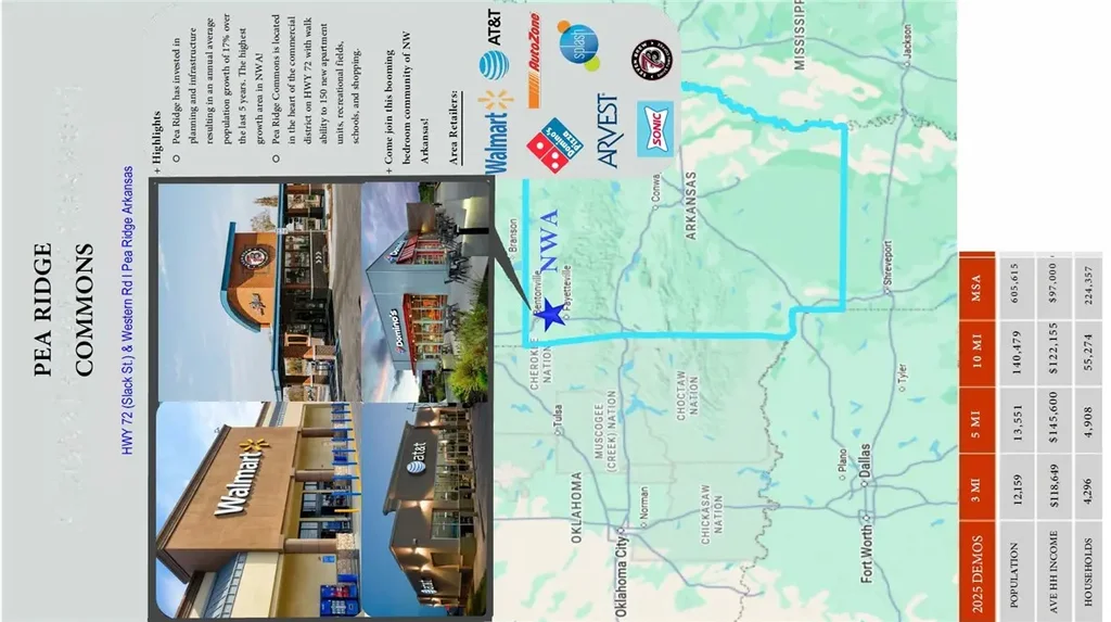 Available for lease, Pea Ridge is booming with an average annual population growth of 20% over the last 5 years. Shops at Pea Ridge Commons is located in the heart of Pea Ridge with the Walmart Neighborhood Market, AT&T, 7Brew, Splash Car Wash, Domino’s, Wendy’s, AutoZone, and a 150-unit multi-family complex. A drive-thru endcap is available, or build-to-suit opportunities are offered on the hard corner.