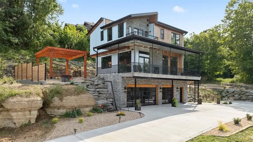 The Cliff House is an architectural short term rental masterpiece! This new construction home is perched just 10 minutes from Downtown Rogers, offering breathtaking lake views from every room. Designed for the best of modern living, the open-concept floor plan features soaring ceilings, custom tilework, a floating metal staircase, and a chef’s kitchen built for entertaining. A fireplace connects indoor and outdoor spaces. Step outside to enjoy a full-length deck, covered lounge, multiple patios, and a custom stone firepit, all positioned to capture the lake panorama. Amenities include a private wine and cigar room with a vault door and exposed cave, blending sophistication with originality. A geothermal system ensures efficient and sustainable comfort year-round. With unrivaled views, striking design, and an exceptional location near public boat launches, the Cliff House is a rare opportunity to own one of the most unique homes in Northwest Arkansas. The second parcel is also listed separately under MLS #1321493