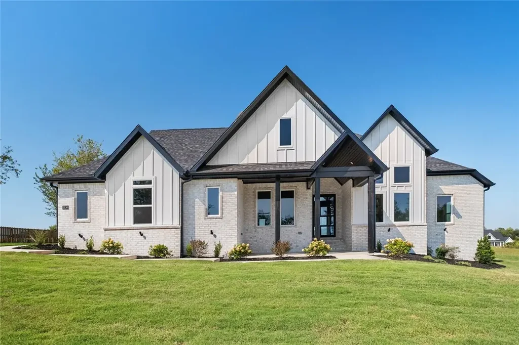 The Knighton Plan located in The Reserve at Wolverine offers 5 bedrooms (4 on the main level), 3.5 bathrooms, and a dedicated office. This open-concept design features a stunning kitchen with custom cabinetry, quartz countertops, and double ovens. The primary suite includes a beautifully tiled shower, stand-alone tub, and spacious wrap-around closet. Enjoy outdoor living on the large covered patio with TV hookup. Fantastic location near Bentonville West High School! Pictures are not of the actual plan, but similar plan and finish. Taxes are based on land only. Builder is offering $7500 towards closing costs or rate buydown. Preferred lender incentives as well!